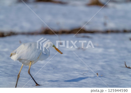 雪の中から餌をゲットしたアオサギ