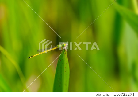 大きな獲物をゲットしたきれいなレモン色のキイトトンボ