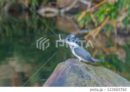 魚をくわえて池の縁石にとまるカワセミ