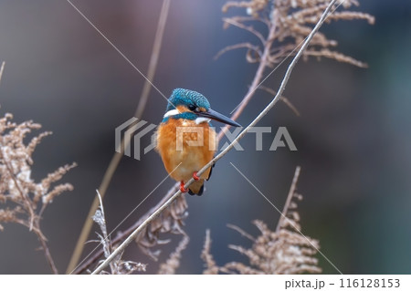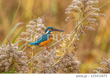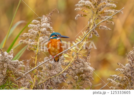 セイタカアワダチソウにとまって獲物を狙うカワセミ成鳥