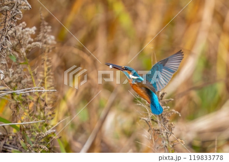 獲物をゲットした繁殖期のカワセミ成鳥メスの飛翔シーン