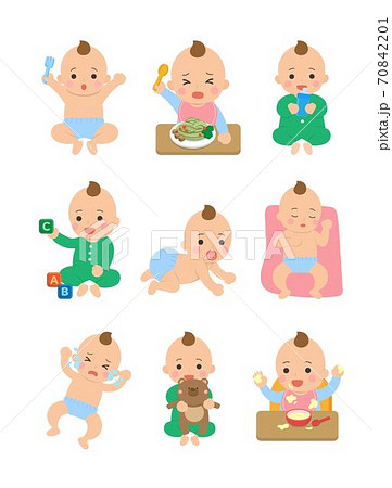 可愛的開心男生嬰兒日常生活,嬰兒尿布,爬行的嬰兒,吃嬰兒麵條,卡通漫畫插圖