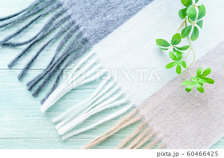 冬物衣類 折りたたんで置いたピンクと白のチェック柄マフラーかストール
