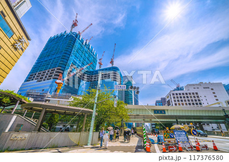 日本の東京都市景観 5月。日本橋一丁目の再開発事業や首都高地下化事業に伴う事前工事などを望む=17日