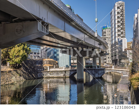 日本橋川の上を通る首都高速道路・日本橋川に架かる常磐橋・国指定史跡「常盤橋門跡」