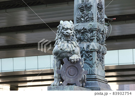 東京・日本橋 日本橋親柱の獅子像と東京市章