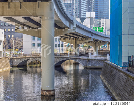 日本橋川に架かる重要文化財「日本橋」・日本橋川の上を通る首都高速の高架橋