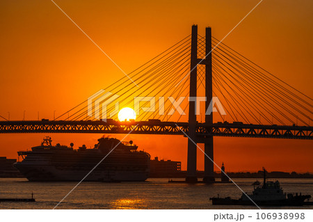 《神奈川県》横浜の夜明け・横浜ベイブリッジと豪華客船