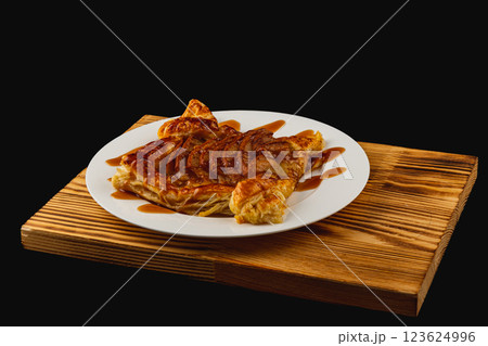 Delicious sweet pastry topped with caramel sauce served on a wooden platter