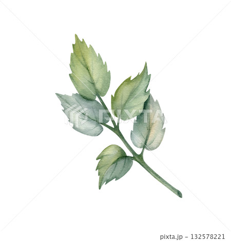 Rose leaf. Green leaves, twig. Delicate watercolor illustration isolated from background. Hand drawn Curved sprig botanical art, rustic style for packaging, wedding invitation, flowers arrangements