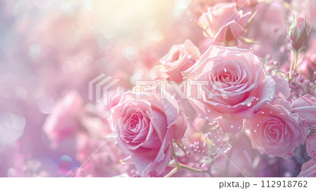 Summer blossoming delicate roses on bokeh background. Pastel and soft floral card. Copy space