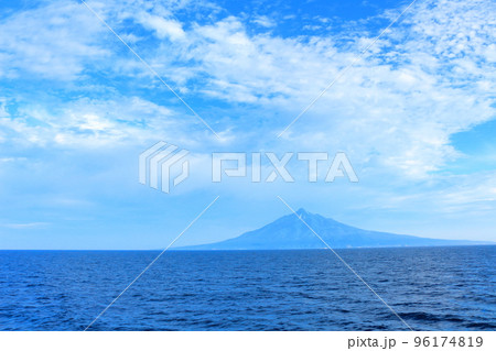 北海道稚内市沖にある礼文島の香深港から稚内港に向かうフェリーから撮影した青い空と白い雲と紺碧の日本海