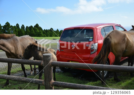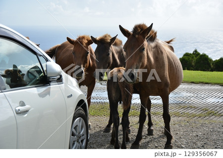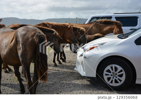 車を取り囲む野生の馬(宮崎県都井岬の御崎馬)