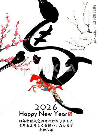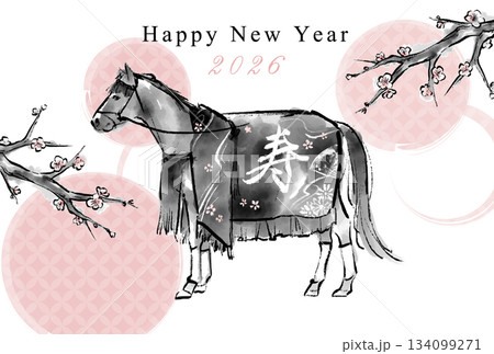 2026年午年 馬と梅の木の水墨画イラスト 和風年賀状テンプレート ベクター素材