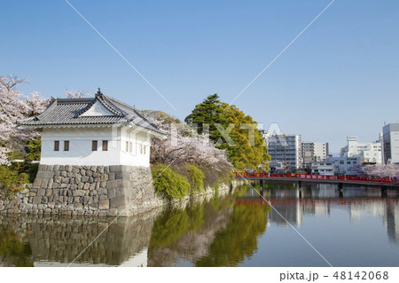 桜咲く神奈川県小田原市の小田原城の東側の外堀から馬屋曲輪と銅門越しに小田原城天守閣方面