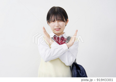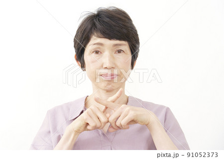 女性 ミドルエイジ 指でバツのジェスチャー 白背景