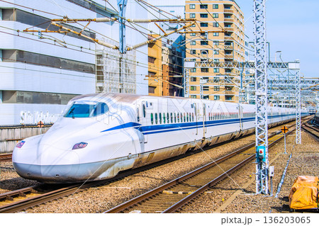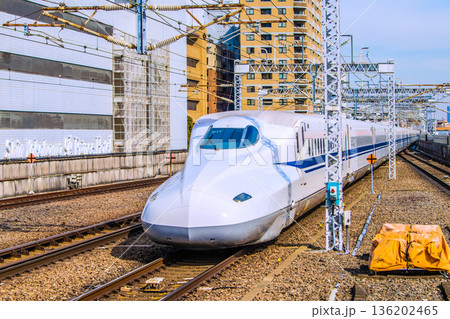 日本の横浜都市景観インバウンド続く…新横浜駅にさしかかる新幹線(N700S・先頭車両)などを望む