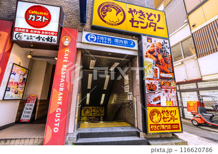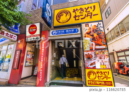 日本の横浜都市景観8番出口…馬車道の歩道から横浜市営地下鉄 関内駅(出入口8)などを望む