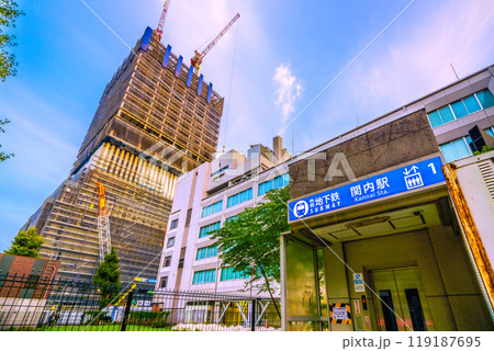 日本の横浜都市景観 関内駅前。旧横浜市庁舎街区と横浜公園を接続する歩道橋工事などを望む=18日