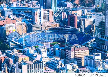 日本の横浜都市景観 横浜スタジアムや関内駅前のベースゲート横浜関内タワーなどを望む=令和7年1月