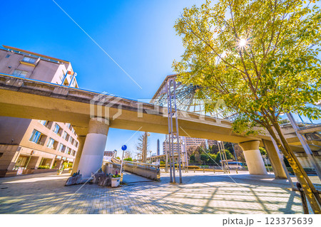 日本の横浜都市景観 年の瀬…横浜市営地下鉄 中川駅など望む。歩道橋に降りそそぐ太陽光…=16日