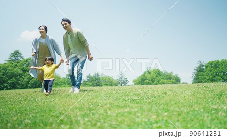 緑の丘で遊びまわる家族