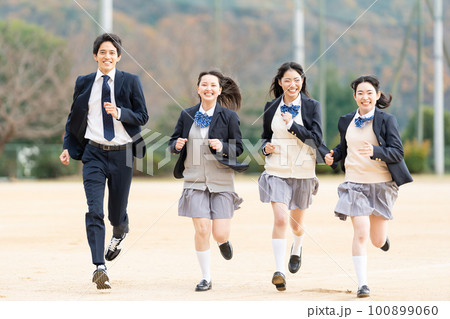 校庭を走る女子高生と男子学生