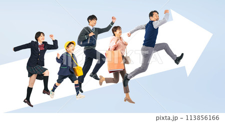 上に向かってジャンプする家族 手作業で精密に切り抜いた背景透過全身写真PNG