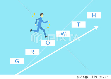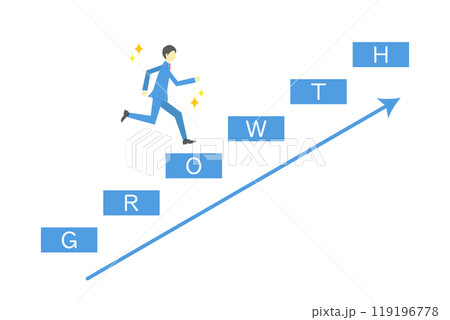 GROWTHの文字が書かれた階段を駆け上るビジネスマンのイラスト