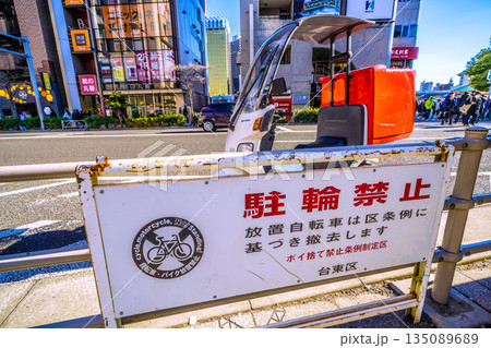 日本の東京都市景観 元日「駐輪禁止 放置自転車は区条例に元づき撤去します」。危険な放置バイク…=浅草