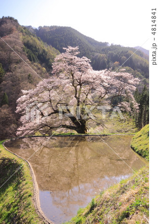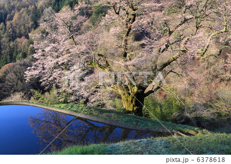 新緑に浮かび上がる「駒つなぎの桜」と水田/長野県下伊那郡阿智村