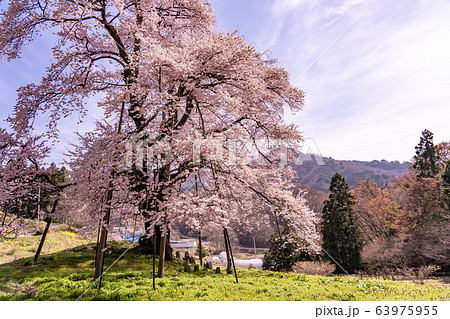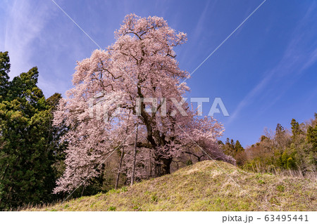 静岡県富士宮市にある狩宿の下馬桜(かりやどのげばざくら)満開の桜と晴れの空