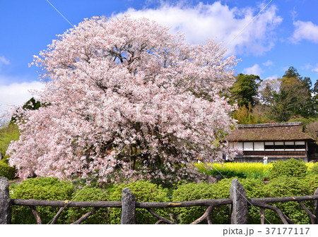 静岡県富士宮市にある狩宿の下馬桜(かりやどのげばざくら)満開の桜と菜の花畑