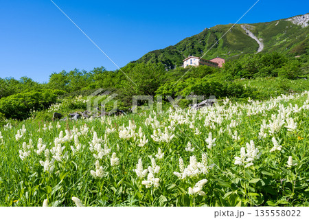 中央アルプス・千畳敷カールに咲き誇るコバイケイソウと宝剣岳