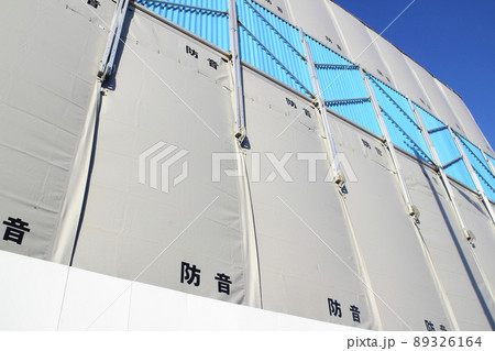 大規模修繕の工事現場 防音パネル仮設の組み立て風景