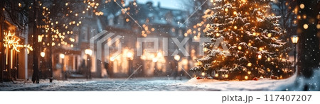 Festive Christmas Tree Lighting in Snowy Town Square at Night