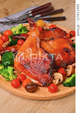 クリスマス用の手作りのローストチキン、ローストレッグ、クリスマスチキン、骨つき鶏モモ肉の照り焼き。
