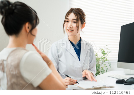 顎整形の美容外科のカウンセリング・医師の診察を受ける女性・診療・問診・相談(顎の悩み)