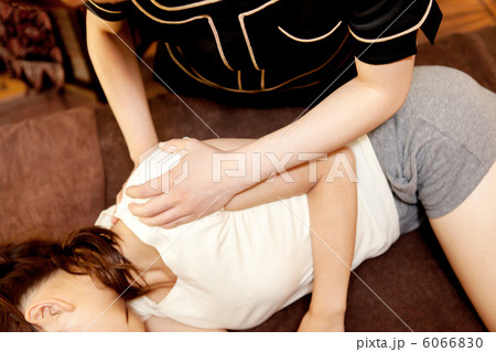 整体(カイロプラクティック)の骨盤矯正中のマッサージを受ける女性