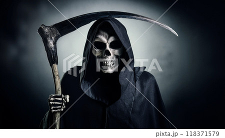 grim reaper cartoon character with scythe standing alone, Generative AI