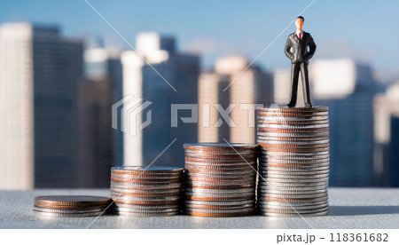 積み上げられたコインの上に立つビジネスマンのミニチュアフィギュア。ビジネスでの収入の上昇のイメージ。