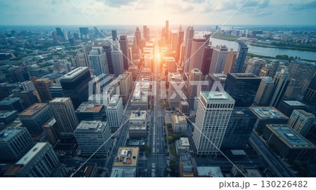 Financial district, business skyscraper, sun glare in the windows of the building - AI generated image