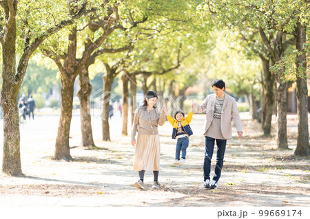 並木道を手をつないで歩く家族
