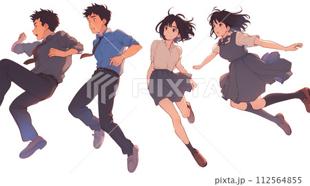 ジャンプする若い男女の学生のイラスト(AI生成画像)