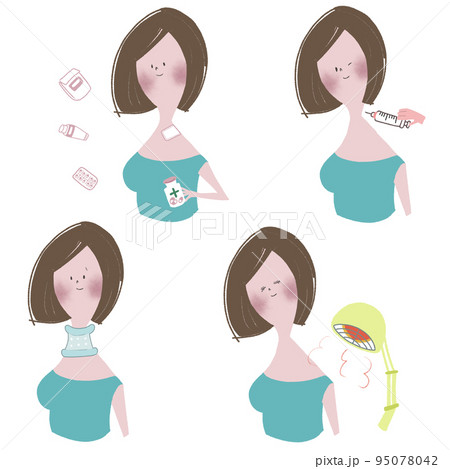 温熱療法、薬物療法、物理療法、装具療法などの頸椎疾患に対する保存療法のイラストセット