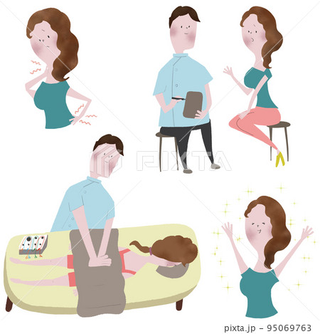 女性施術師による、整体、柔整、マッサージの治療の流れと、治療のビフォアアフターを表したイラストセット