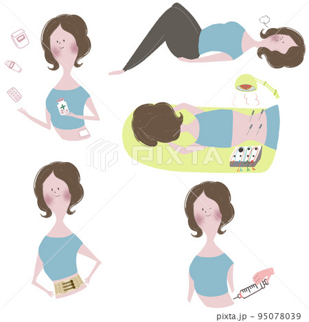 温熱療法、薬物療法、物理療法、装具療法、運動療法の腰椎疾患に対する保存療法のイラストセット