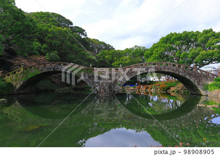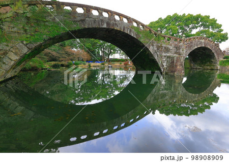 [九州・長崎] 諫早公園の池に対称的に反射される眼鏡橋の風景。