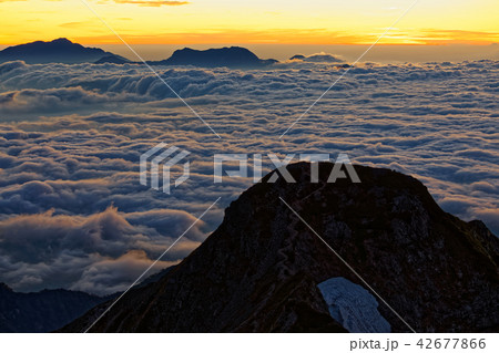 夜明けの雲海と鹿島槍北峰・妙高山と高妻山を望む