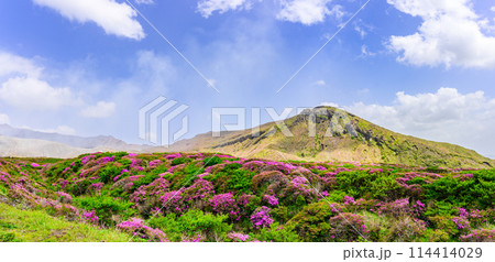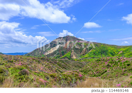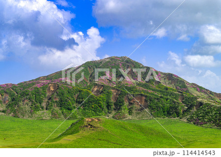 ミヤマキリシマの花が咲く烏帽子岳を背景に草千里ヶ丘風景 (阿蘇山中岳・阿蘇火口周辺)